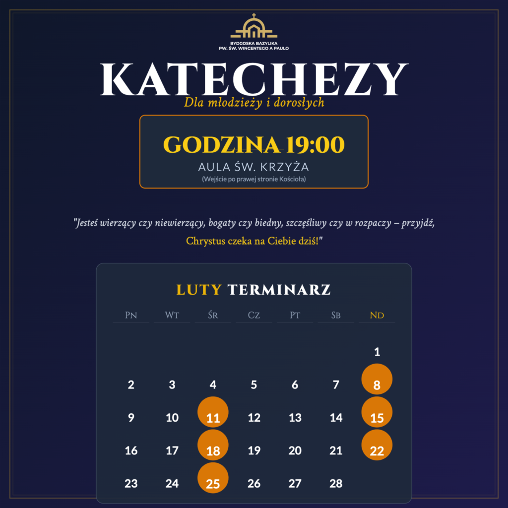 To są tzw. katechezy, ale nie bój się tego słowa. To nie jest lekcja religii ze szkoły. Nikt Cię nie będzie pytał, nikt nie będzie oceniał Twojego życia. To czas, kiedy możesz usłyszeć Słowo, które – dosłownie – stawia na nogi. Słowo o tym, że Twoja historia ma sens. Że Twoje cierpienie, samotność czy problemy z bliskimi nie są końcem świata, ale mogą być początkiem czegoś nowego.